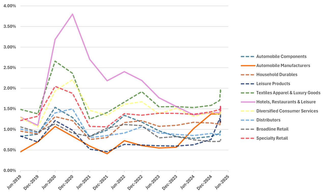 Figure 2 demonstrates the evolving risk profiles of sub-industries within the consumer discretionary sector from the pandemic era to the present, highlighting their divergent post-crisis trajectories. Taking hotels, restaurants & leisure, and automobiles industries as an example, both industries experienced significant credit stress during the COVID-19 pandemic (2020-2022), with median RG default probabilities spiking sharply as consumer demand collapsed. Post-pandemic risk profiles, however, have diverged - particularly since 2024. Automotive sector has grown more vulnerable to tariffs risks due to its reliance on globalized supply chains (e.g., parts sourced from Mexico/Canada), higher labor and production costs associated with reshoring, and consumer price sensitivity. In contrast, consumer services industries (e.g., hotels and cruises) face less direct exposure to imported goods or trade policy disruptions due to their more localized operations.