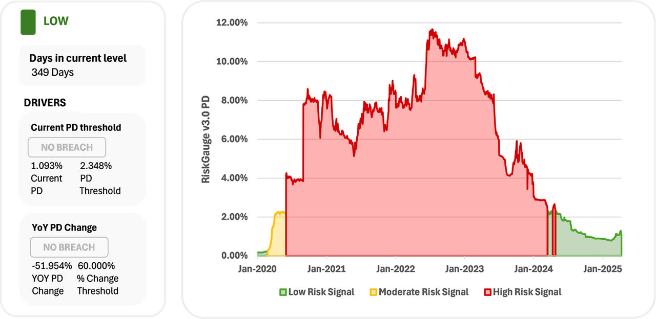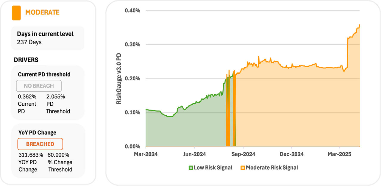 To illustrate how RG and related Early Warning System (EWS) work at individual company level, let’s take a deep dive into two specific companies in the aforementioned industries. The EWS continuously monitors RG PD scores, applying predefined thresholds to detect deviations that signal rising credit risk and the heightened potential for default crystallization. Risk alerts are communicated via an intuitive traffic light color scale, where each color indicates a distinct default risk level. This framework translates granular PD fluctuations into actionable strategic guidance, enabling stakeholders make timely and informed decisions, whilst focusing on the companies that matter.[3]