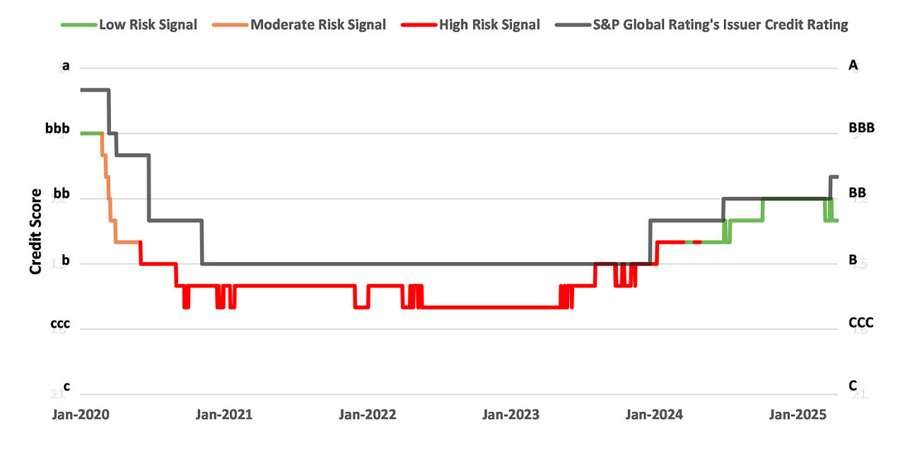 Carnival derives the majority of its passenger base from North America and Europe. As shown in Figure 3, the EWS has consistently generated clear signals over the past five years. The EWS shifted to “amber” in early 2020 during the onset of the COVID-19 pandemic, escalating to “red” later that year amid severe operational disruptions and heightened default risk. Post-pandemic, the EWS reverted to “green” as Carnival regained financial stability through robust booking demand, deleveraging efforts, and a rebound in consumer travel spending. S&P Global Ratings’ issuer credit ratings (ICR) are included for comparative context (Figure 4). This alignment highlights the EWS’s ability to distinguish between normal fluctuations in RG PD scores and material credit risk events, demonstrating its value in proactive credit risk management.