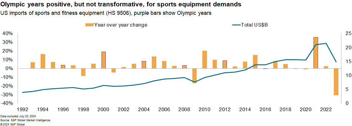 The Olympic and Paralympic Games Paris 2024 from July 26 onward represent the peak of a four-yearly cycle of sports promotion, with the Olympic organization's charter including the promotion of sports for all. A general downturn in global trade in sports goods suggests a new round of inspiration for sports and fitness activities is needed. From a peak of $20.97 billion in 2021, US imports of sports products fell to $14.85 billion in 2023.
