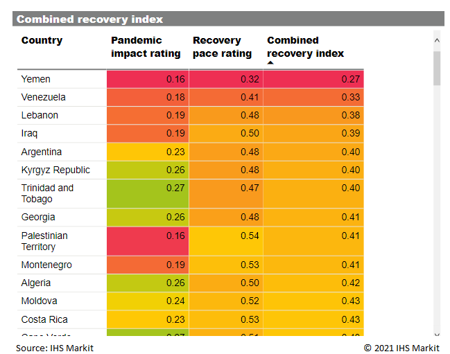 The coronavirus disease 2019 (COVID-19) pandemic has had uneven impacts across different countries and regions. The speed of recovery is also likely to differ widely, depending on a range of underlying factors, such as public health capacity, economic policies, and the political environment. To help navigate the different pathways out of the COVID-19 pandemic and understand the implications for the business environment, we produced a comparative recovery index based on the impact of COVID-19 across several dimensions and the speed of recovery to pre-pandemic levels.