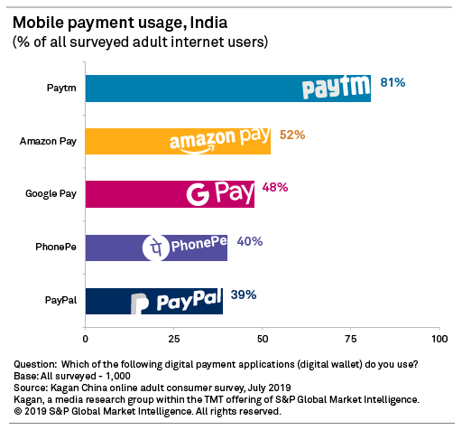 Alibaba Group Holding Ltd.-backed Paytm was the clear favorite among digital payment apps, with 81% of respondents saying they use the homegrown app. Other payment apps used by survey respondents include Amazon.com Inc.'s Amazon Pay (India) Pvt. Ltd. at 52%, Google LLC's Google Pay at 48%, and Walmart Inc.'s PhonePe Private Ltd. at 40%.
