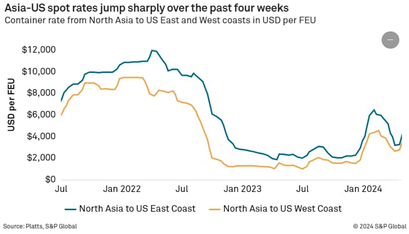 Capacity in the Asia-US trades is exceptionally tight right now due to a confluence of factors, the main one being the ongoing vessel diversions around southern Africa to avoid Houthi militant attacks in the Red Sea and Gulf of Aden, which is forcing carriers to avoid the Suez Canal. The much longer route is adding more than 10 days to voyages from Asia to Europe and the US and is absorbing a significant amount of capacity.