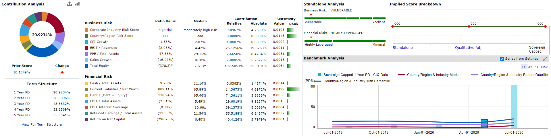 The company had been experiencing issues for a significant length of time with a PDFN in, or close to, the worst 25% of companies in the region and industry in the last three reporting periods starting fiscal quarter (FQ)4 2019, and in the worst 10% for the final reporting period. As shown in Exhibit 2, the largest factor contributing to the increase in PD was total equity, which was increasingly negative every quarter since FQ4 2019. Total equity decreased by more than 2,000% between FQ4 2019 and FQ1 2020, falling from $4 million to -$98 million. This trend continued between FQ1 2020 and FQ2 2020, ending with total equity of -$378 million.