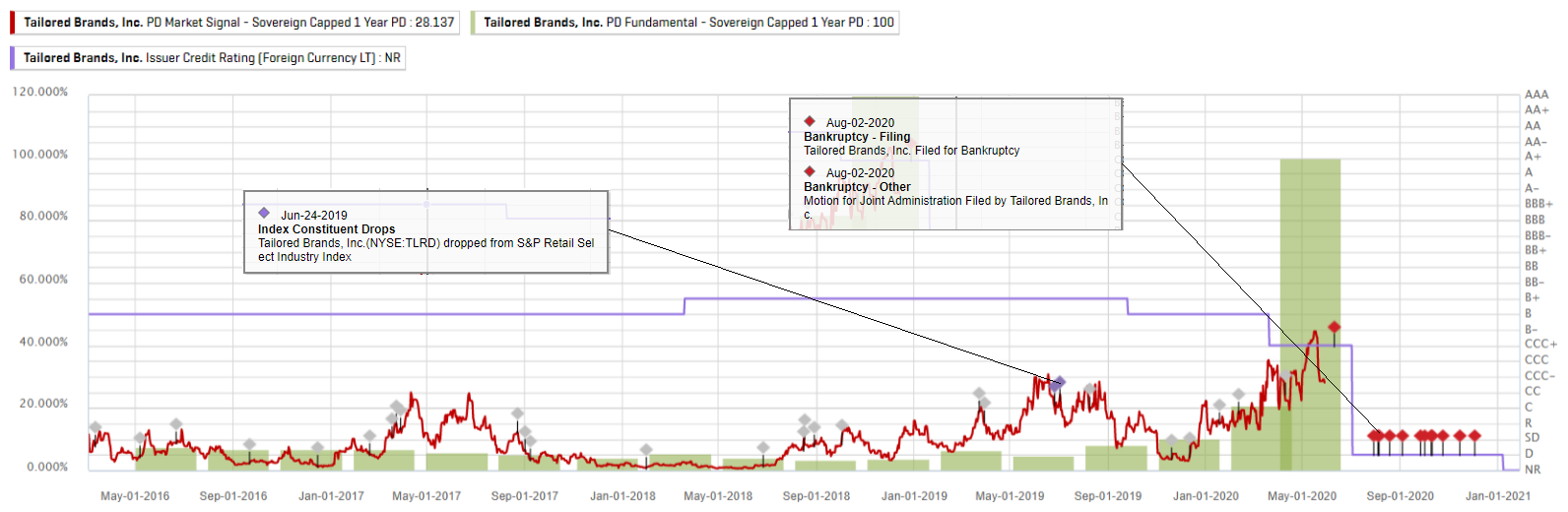 As shown in Exhibit 1, the one-year PDMS experienced a near four-fold increase between January 3, 2020 and May, 15, 2020, jumping from 12.91% (an implied credit score of ‘ccc’) to 44.47% (an implied credit score of ‘cc’). This was three months before the company filed for bankruptcy and seven weeks before its rating downgrade by S&P Global Ratings from ‘CCC+’ to ‘D’. By May 28, 2000, the implied score for the company was ‘ccc-’. Similarly, the one-year PDFN exceeded 10% since Fiscal Quarter (FQ) 4 2019, and had reached 20.92% by May 2, 2020 (an implied credit score of ‘ccc’). The COVID-19 outbreak had significantly impacted the financial condition of the business through the first quarter of 2020, resulting in the temporary closure of its stores and the need to furlough all U.S store employees and temporarily layoff all Canadian store employees.