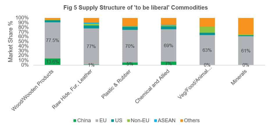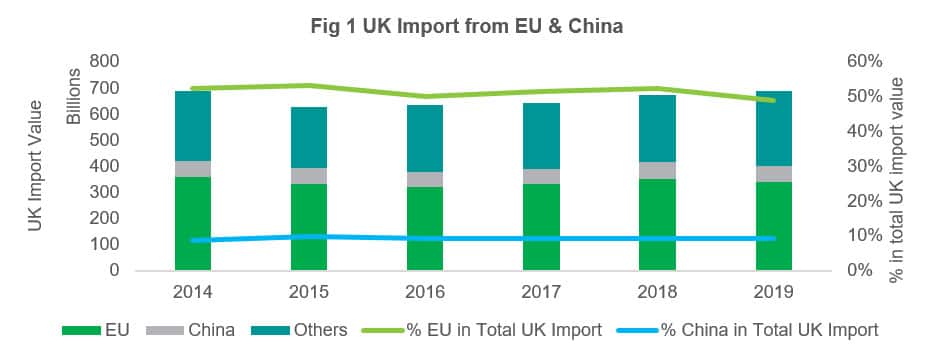 China is UK's third largest import trade partner in recent years holding steady at 9% market share. While trade talks around 'Brexit' mostly centred on the trade relationship between the UK and the EU, it is also worth looking at which specific products will fall under the 'liberalised' category. China may end up benefiting from benefiting from this new regime due to its cost competitiveness.