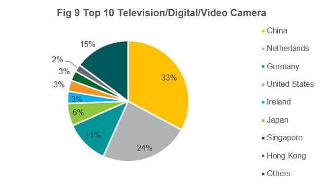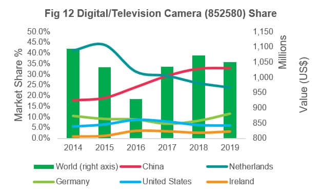 While in digital/television camera items, we can see rapid growth leading to an increase in dependency between 2015 and 2019, while the Netherlands declined in supply, thus overpassing the latter since 2017 to become the largest supplying market.