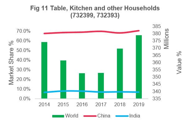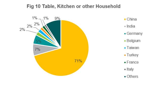 Looking at the trade pattern for these three groups of products in the last six years, China's market share in table, kitchen and other households products sit relatively stable at ~70%, far ahead of other markets. The second supplying origin, India, accounts for around 7% annual UK imports.