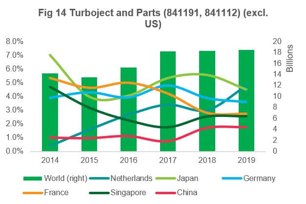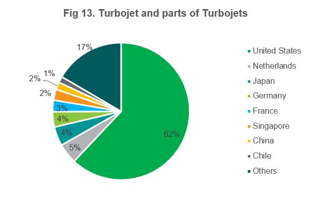For turbojets and parts thereof, where the US and EU dominate the supply chain, we can see China hold a relatively minor share of the market, but similarly to the electrical (i.e. 852580) goods mentioned above, appears to be experiencing rapid growth in recent years.