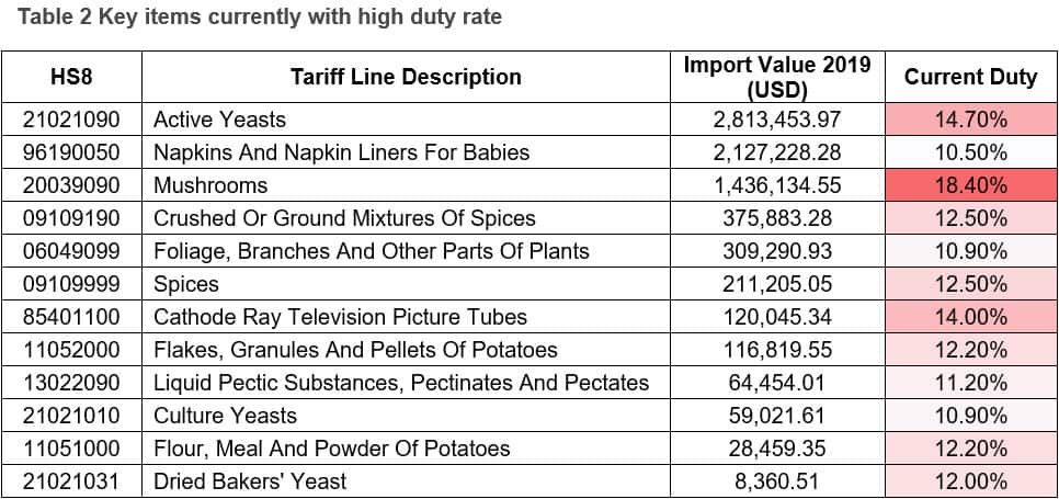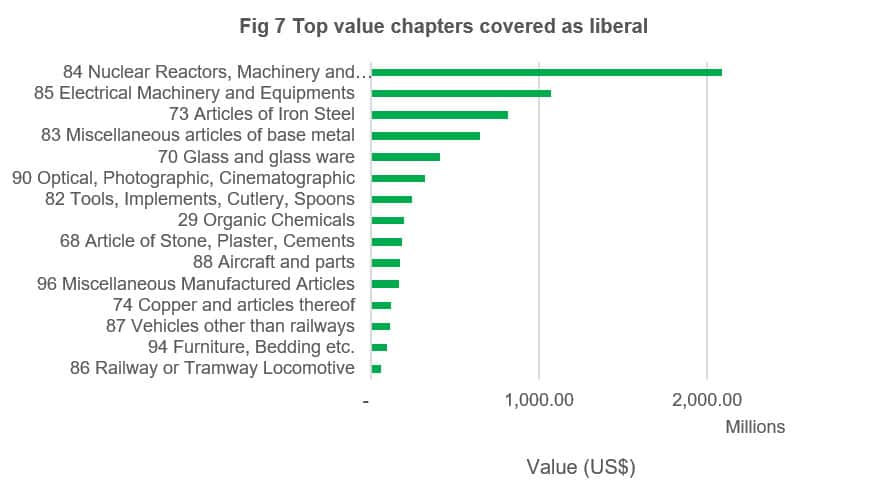 In terms of the absolute value covered by to be 'liberalised', HS Chapters 84 and 85 which refer to machinery and electronic equipment are at the top of the list with US$ 2.08 billion and US$ 1.07 billion imports (2019). Other HS chapters with significant trade value include iron steel products (HS 73), article of base metal (HS 83) and glassware (HS 70).