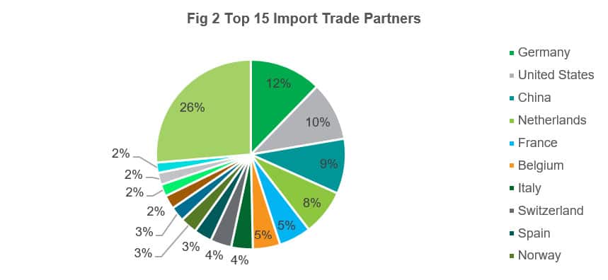 In 2019, the UK's top 15 import trade partners represented more than 70% of the total UK's imports, among which eight were from the EU. Germany is the largest import origin country, accounting for 12.3% of UK imports, followed by the United States and China. Within the EU, Netherlands, France and Belgium are also among the major import partners.