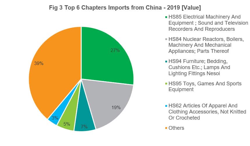 In terms of trade with China, Electrical machinery and equipment (HS Chapter 85) is the largest commodity group with 17.39 billion USD in 2019, accounting for 27% of total import value from China; followed by Machinery and Mechanical Appliances (HS 84). Both are electrical and mechanical sector; furniture, toys and apparel articles are also among the top five categories.