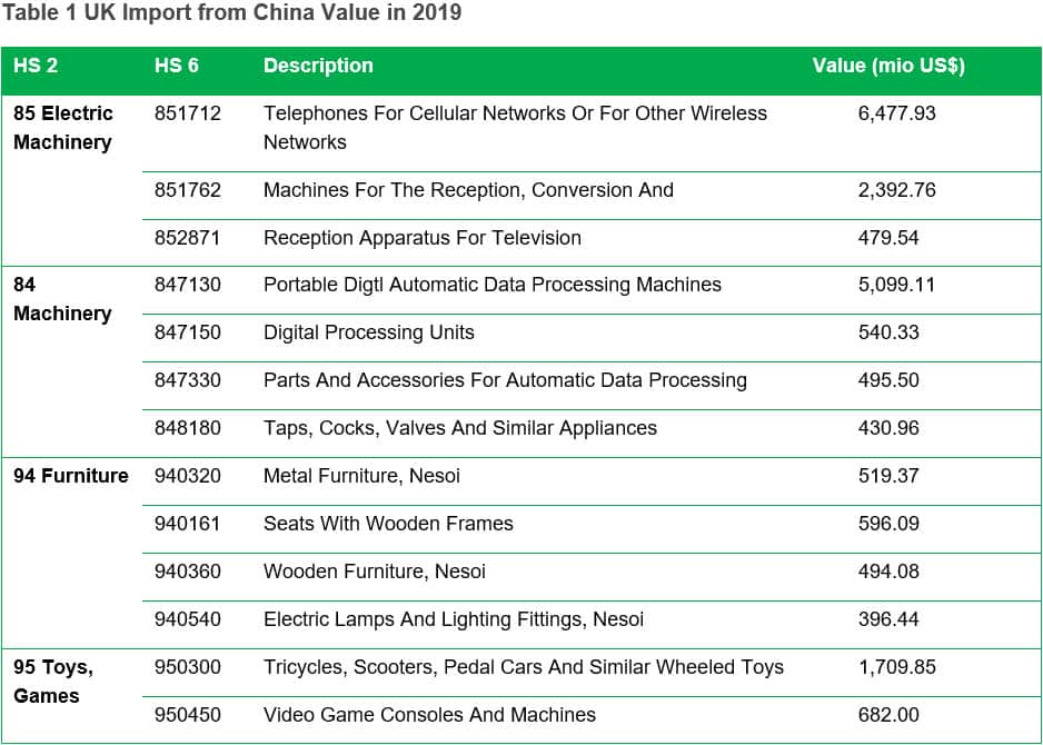 Looking at the more detailed six-digit HS Code Level beneath these chapters (Table 1), we can see that electrical and machinery products are still the majority in terms of trade value. It is also interesting to note that certain consumer products such as furniture (HS94) and toys, games & sports equipment (HS95) are also notable categories when looking at UK Imports from China.