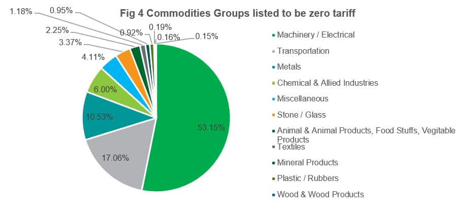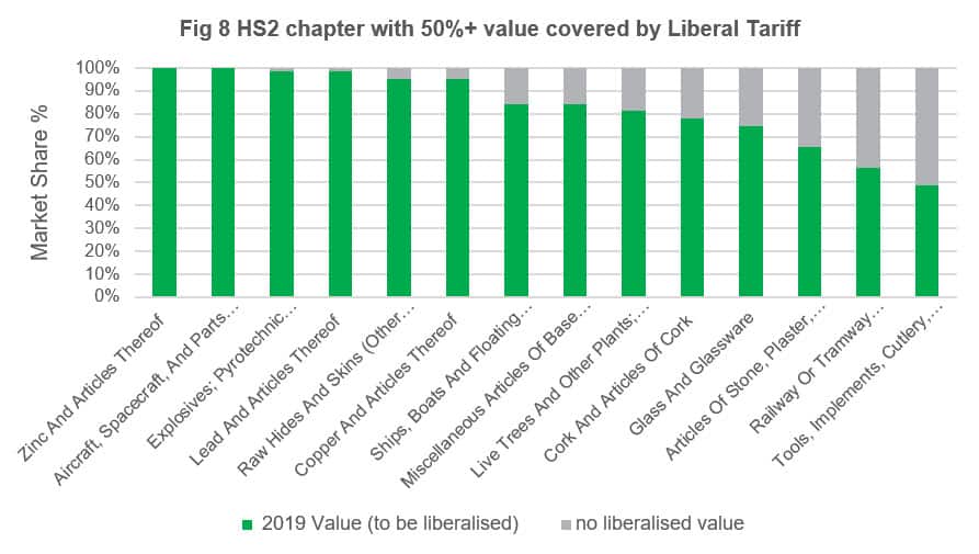Alternatively, to identify areas of potential diversification, we can explore by Chapter the percentage share by value of goods eligible to zero tariffs. Of these, zinc and aircraft parts are fully covered by the 'liberalised' scheme. As previously mentioned, zero tariffs can benefit other economies through diversifications; it might be that due to already established tariffs, it was preferential to trade with the EU for certain commodities, whereas this liberalisation could allow for further exploration and sourcing from Asia.
