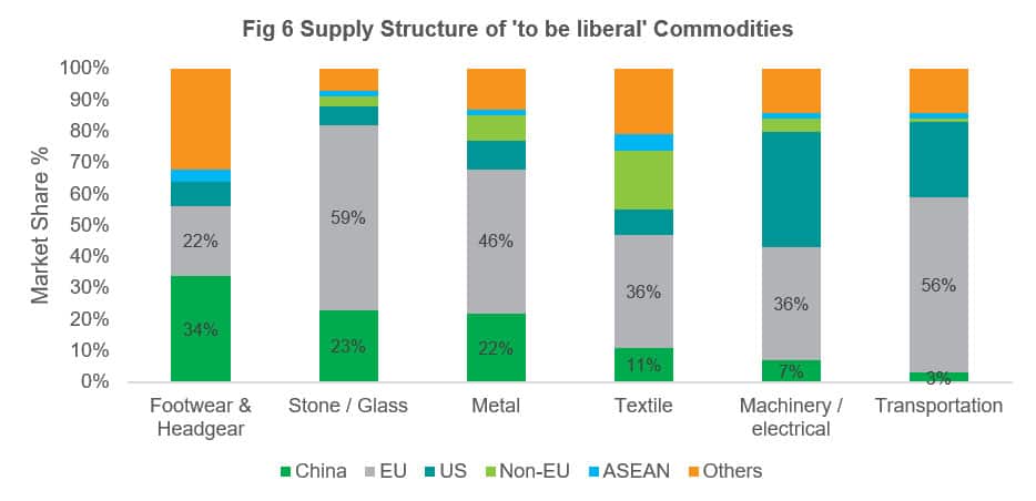 A total of 2,001 items were mapped into 12 commodity groups devised by IHS Markit. These include Chemicals, Transport, Machinery/ Electrical, Textile, Animal/Food Stuff, to name a few. Looking at the import structure of these products in 2019, the machinery classification accounts for 53.15% of total UK Imports of goods which were noted as 'liberalised', followed by transport (17.06%) and metals (10.53%). The full distribution of the commodities group is shown in Figure 2 below. We then analysed their import dependencies and alternative sourcing markets other than China to scope out the competitive landscape as well as see who would benefit from zero tariffs.