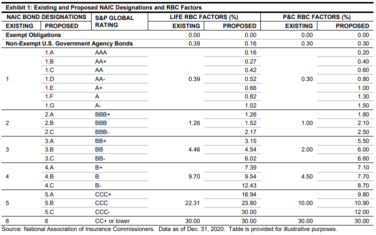 The National Association of Insurance Commissioners (NAIC) regularly updates its regulations. In 2020, the NAIC proposed a more granular set of designations for bonds. The proposed regulations expanded the number of designations from 6 to 20. These proposed designations align closely with the ratings provided by nationally recognized statistical ratings organizations, such as S&P Global Ratings (see Exhibit 1). The proposed expanded factors also add more transparency to the varying degrees of risk within insurers' fixed income securities.