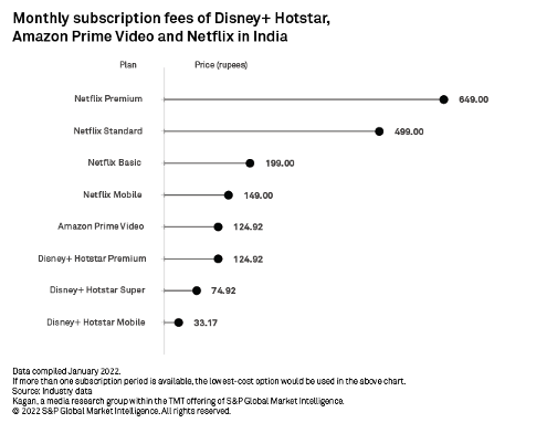 Streaming competitions in India intensified as Netflix Inc. reduced its subscription fees in the market for the first time on Dec. 14, 2021, the same day that Amazon.com Inc. raised its Prime membership rates by about 40% to 50%. The pricing of all Netflix plans was cut. The biggest markdown was for the basic plan that dropped from 499 rupees to 199 rupees per month, translating to a 60.1% decrease. Walt Disney Co.'s Disney+ Hotstar, which had just increased the charge of its basic (mobile) plan on Sept. 1, soon followed to offer two discounted rates of 49 rupees and 199 rupees for subscription periods of one month and six months, respectively, for its mobile plan.
