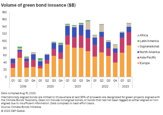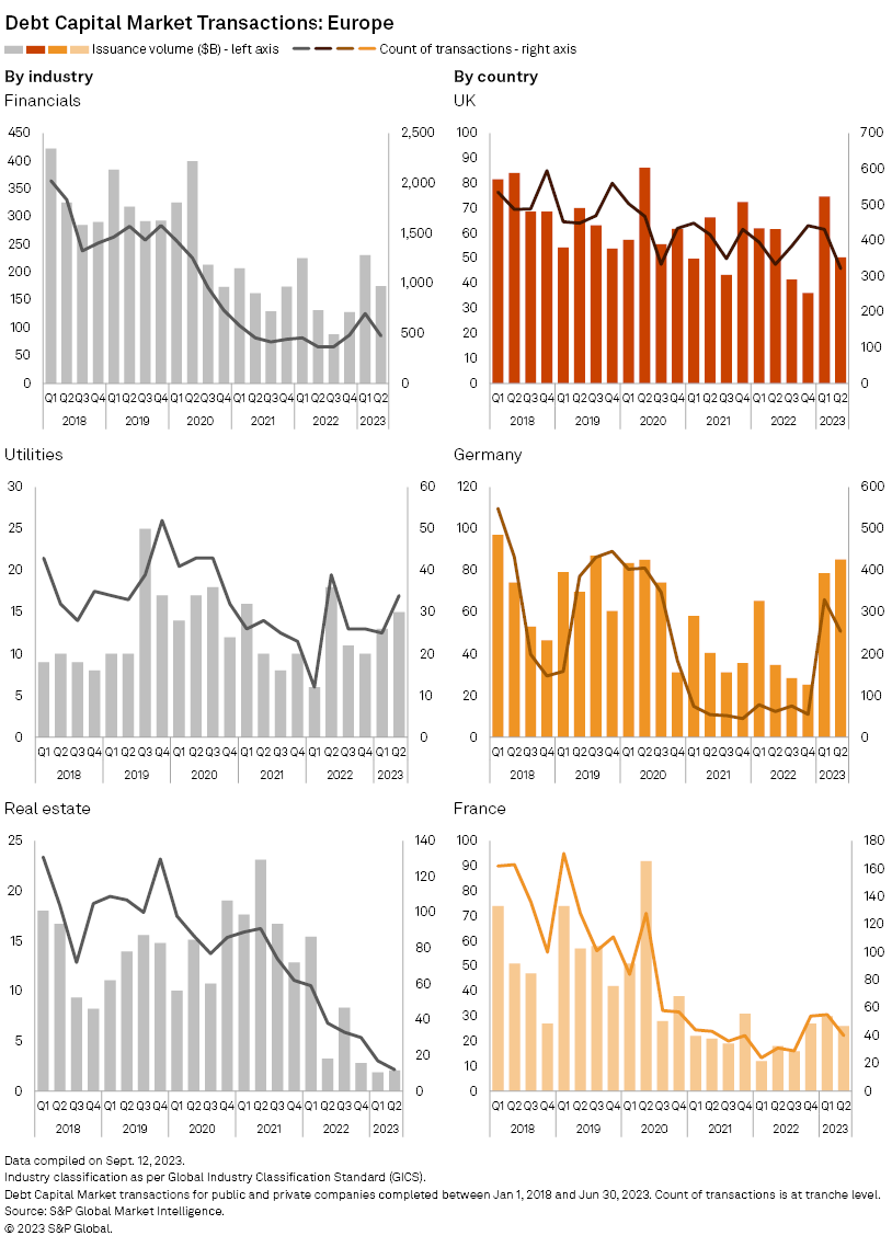 Within Europe, financials sector accounted for 70% of total transaction volume since 2018, which saw a decline in issuances during the last few quarters, dampening the overall issuance volume of Europe. 2023 Q1 saw an increase compared to previous quarters, which was driven primarily by DZ Bank, Landesbank Hessen-Thüringen, and KfW in Germany. The real estate sector was also hit hard with 2023 Q1 having the lowest volume of issuances and 2023 Q2 having the lowest count of transactions. On the other hand, European utilities performed strong with 2023 H1 having 54% higher issuance volume compared to 2018 H1. Energy transition is a major theme across utilities sector within Europe, which requires substantial capital expenditure and the need to issue debt.