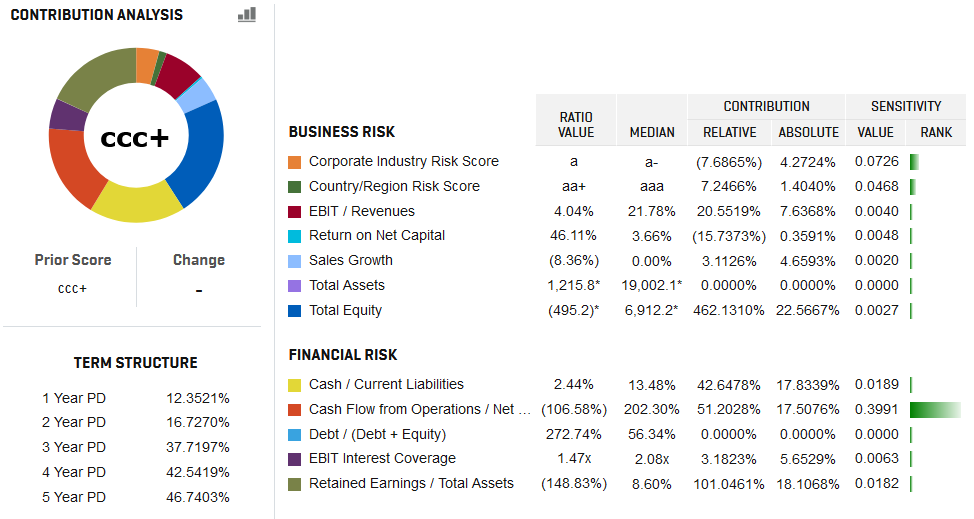 Unlike in the CM 3.0 calculation, the company shows negative Total Equity and negative Retained Earnings/Total Assets in PDFN 2.0, which have a high absolute contribution to the ‘ccc+’ score. So, why did we not choose the same set of financial ratios when training these two models? There are two main reasons:
