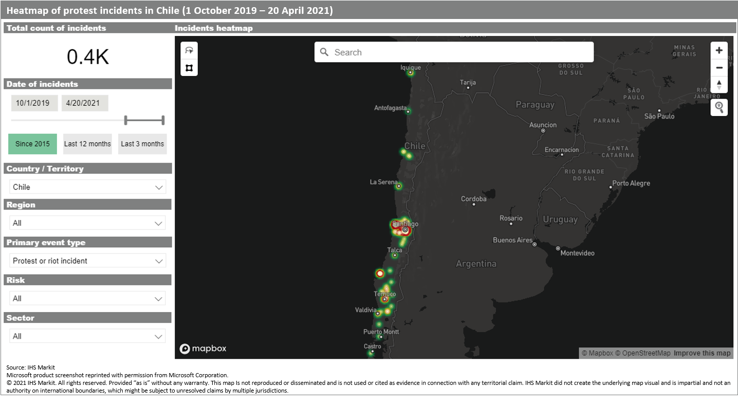 In contrast to late 2019, when massive widespread and violent unrest went on almost uninterrupted for weeks at a time, protests through the end of 2021 are likely to be more localized and short-lived. Again, a prime hotspot will be Santiago city center, along the Alameda avenue from Plaza Italia/Plaza Baquedano towards the Central Station and near the La Moneda presidential palace. Outside Santiago, Concepción, Valparaíso, and Antofagasta are also likely to be impacted. Retail stores will remain the primary target of looting, while public transport infrastructure, police stations and vehicles, and government buildings are likely targets of arson.