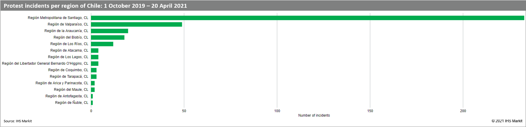Outside the capital, we have tracked around 50 protests in Valparaíso, the eponymously named capital of which is Chile's second-largest city and around 100 kilometres east of Santiago. Next comes a cluster of southern regions, where the abovementioned underlying grievances are also latent but also include demands for the rights of the Mapuche indigenous population.