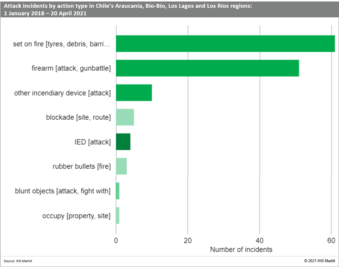 The abovementioned risks are likely to remain high in the coming year, as radical groups are becoming more organised (e.g. the carrying of firearms and use camouflage clothing and bulletproof vests are now much more common) and their attacks more aggressive, often burning several vehicles or machines, sometimes more than ten, at a time. For example, on 5 April 2021, eight masked individuals broke into an estate belonging to forestry firm Mininco in Toltén, Araucanía, and set fire to eight vehicles, including a cargo truck, a forestry crane and harvesting machinery.