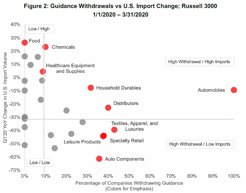 U.S. import activity associated with companies in the Russell 3000 indicates that industries with the greatest guidance withdrawals also tended to see a decrease in year-over-year shipment volume in the first quarter (Figure 2). Until corporate guidance for those firms resume, shipment data provides an indication of industry activity and corporate outlook.
