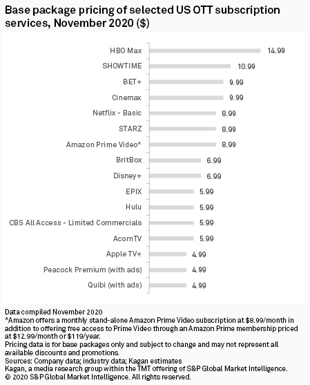 Quibi's content library was also limited, launching with roughly 50 hours of content versus tens of thousands of hours of content at rivals such as Amazon Prime Video, Netflix and Hulu. Unlike new services launched by Disney and AT&T Inc., Quibi had no existing catalog of content to underpin its offering and was building its library from scratch. Quibi's $4.99/month ad-supported tier was at the low end of the SVOD pricing spectrum but faced difficult comparisons to other ad-supported base tiers from CBS All Access, Hulu and Peacock Premium at similar price points, each of which offered far more content and programming than Quibi.