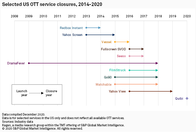 Quibi joins a relatively short list of major U.S. SVOD and ad-supported services that have closed in recent years, including similar mobile-first offerings geared toward younger viewers such as Verizon Communications Inc.'s Go90 service and Vessel. While massive amounts of video content are consumed on mobile devices each month in the U.S., especially among younger demographics, luring viewers away from their favorite creators and channels on YouTube, Facebook, Snapchat and TikTok has proven difficult.