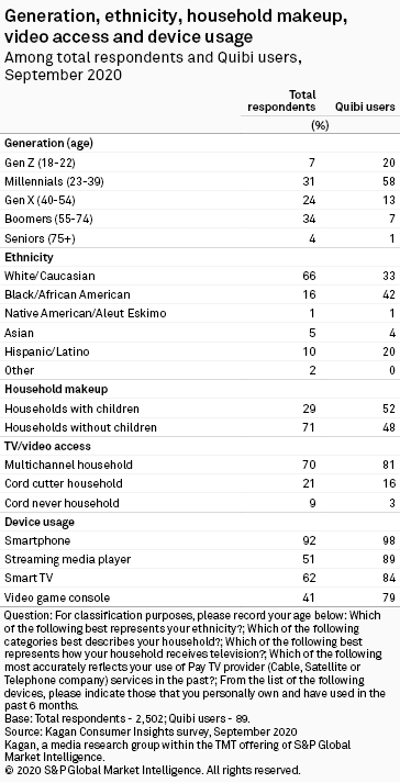 Kagan's Consumer Insights survey data from September 2020 showed Quibi usage overwhelmingly coming from younger viewers, with nearly 80% of Quibi users coming from Gen Z/Millennial age brackets. Quibi's audience was also far more ethnically diverse than total overall survey takers, especially among Black/African American (42%) and Hispanic/Latino (20%) users. Quibi users were also much more likely to have streaming media players, smart TVs and video game consoles in the household. Quibi launched with support for viewing on mobile devices only, scrambling months later to add support for AirPlay and Chromecast and native apps for select streaming media devices.