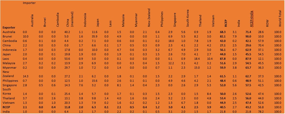 The share of RCEP countries of merchandise exports in 2020 (GTA Forecasting, %)