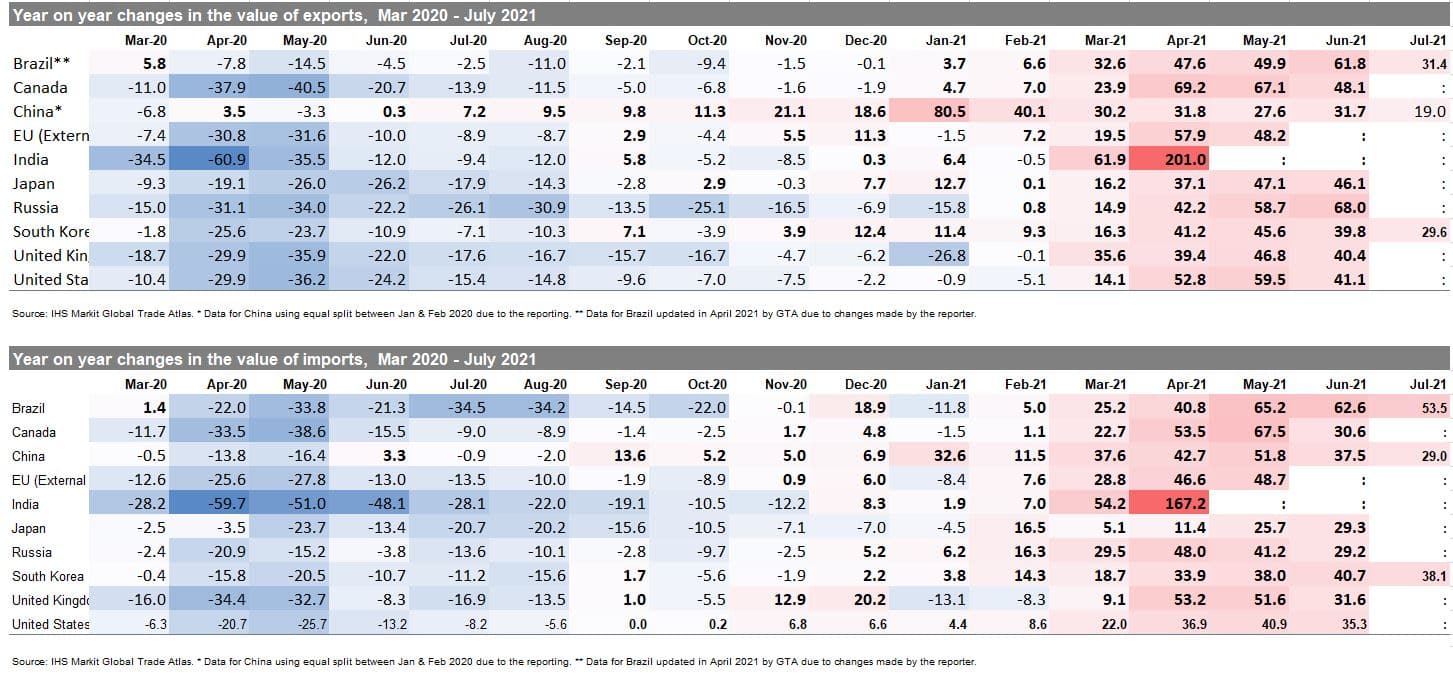 - Only three states have already reported data for July 2021 - Brazil, China & South Korea; the resulting yoy growth rates are positive but significantly lower than observed in the preceding months, in line with our earlier expectations; the growth rates are at the same time, higher in imports than in exports