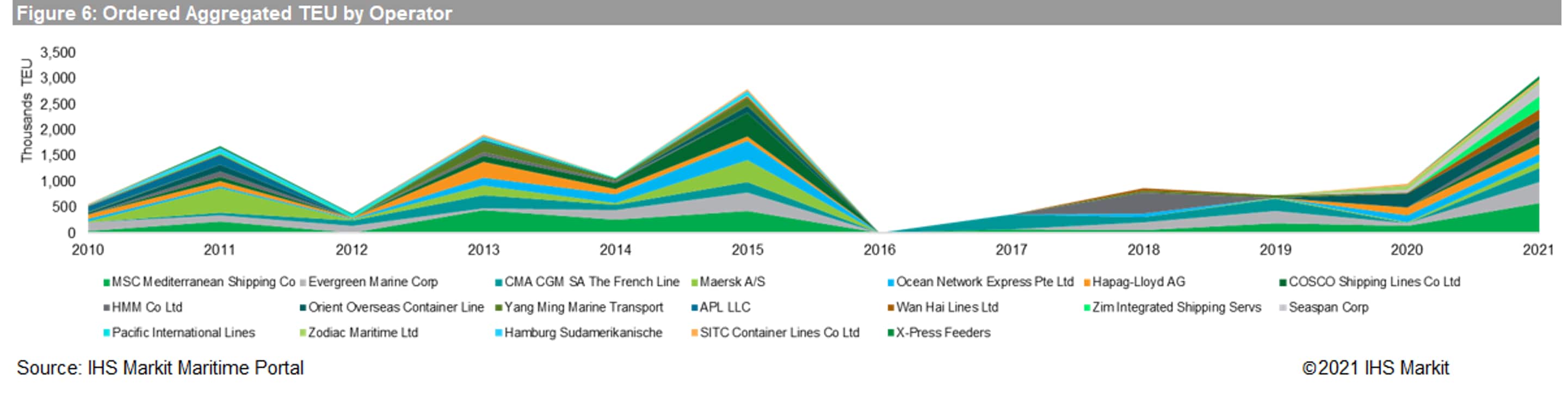 Many of those placing orders are familiar to shippers, among top operators, Evergreen and MSC operate 201 and 168 ships, taken up 13% and 18% respectively in terms of total TEU - though apparently average size of the two operators varied. They are followed by COSCO/OOCL, CMA CGM and Maersk. Some regional shipping lines. Wan Hai and SITC, also are placing significant new orders, though seems to be in smaller segments.