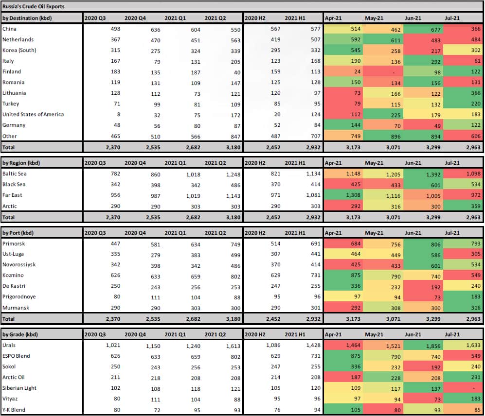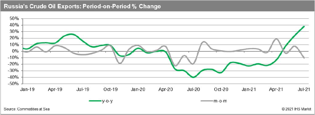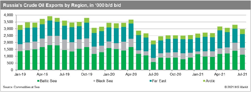 With the gradual easing of OPEC+ production restrictions, total Russian crude oil exports in June rose to a 14-month high of 3.3 million b/d, with Urals averaging 1.85 million b/d, the highest since April 2020. Exports of this grade averaged 1.43 million b/d in H1 2021. Total shipments of ESPO Blend fell to 740,000 b/d in June, with preliminary data for July showing exports of just 550,000 b/d in the first 12 days of the month.