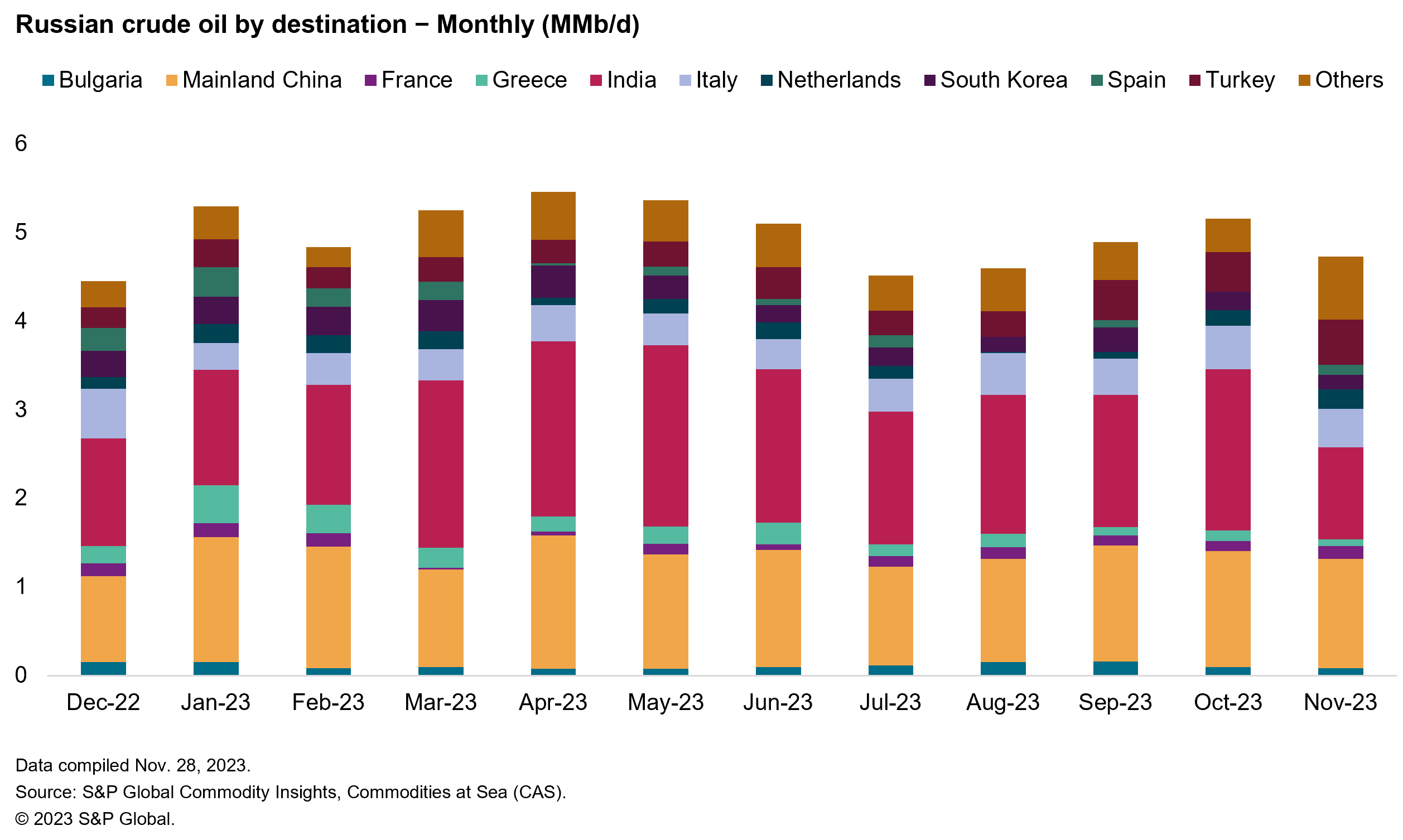 The destinations for Russian crude have remained largely spread across mainland China and India since the price cap introduction. There has been an increase in September through to November 2023 for Turkey as a destination.