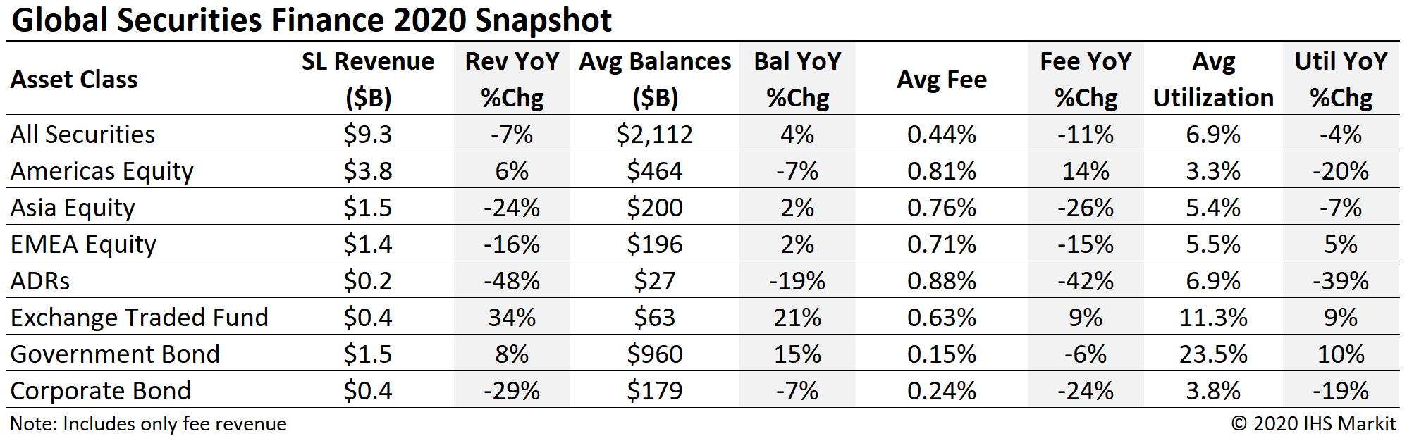 Global securities finance revenue $9.3bn for 2020, a 7% YoY decline. The primary growth drivers for equities were increased borrow demand during the Q1 market decline followed by borrow demand tied to capital raising during the recovery. Peak monthly revenue for 2020 was observed in June, when a trio of US equities delivered outstanding lending returns on the back of corporate action related arbitrage opportunities. A most welcome end to 2020 was made by December notching the 2nd most monthly revenue at just over $900m, an increase of 12% YoY. Lendable assets reached a new all-time in December, nearly $30T, adding to the challenge of increasing utilization going forward, however a similar statement could have been made at lower levels entering 2020 before the surge in utilization during the Q1 decline. Many of the drivers of the revenue upswing in Q4 remain in place heading into 2021, including increased traditional and SPAC IPOs, public short seller campaigns and ETF usage.