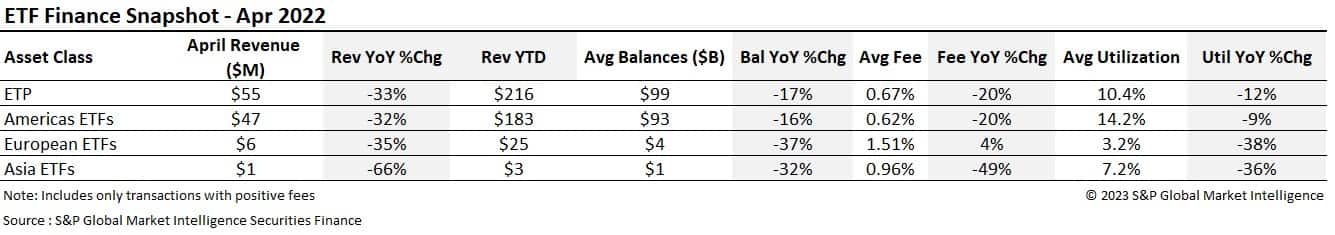 Securities finance revenues across all exchange traded products continued to decline over the month. This is an ongoing trend across the asset class and is unsurprising given the strong revenues that were generated throughout 2022. During the month ETPs generated $55M in securities lending revenue. 85% of these revenues were generated by US ETFs, with European ETFs generating just $6M. Despite the 35% decline in revenues YoY, average fees across European ETFs increased 4% to 151bps. Average fees across the asset class maintained the Q1 average of 67bps.