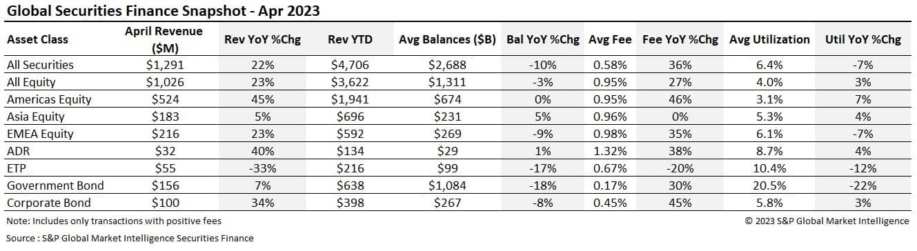 Financial markets experienced another action-packed month with the after-effects of the liquidation of Silicon Valley Bank and Signature Bank in the US and UBS's purchase of Credit Suisse still being digested by market participants. Despite the ongoing uncertainty created by further interest rate ambiguity and continued concerns regarding the financial sector, securities finance revenue experienced another impressive month. During April, $1.291B in securities finance revenues were generated. This is an increase of 22% YoY and 4% MoM. Average fees increased across all securities to reach 58bps (+36% YoY). This is due to lending rates moving higher across EMEA and the US. Revenues increased across all asset classes over the month (YoY) apart from ETPs which experienced a decline of 33% YoY and 19% MoM. Momentum across fixed income markets was maintained as corporate bond revenues hit $100m for the third time this year whilst government bond revenues increased 7% YoY to $156M.