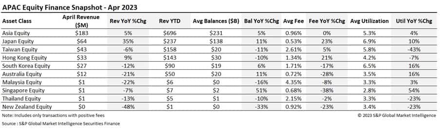 In Taiwan, despite revenues falling YoY, April was the highest revenue generating month year to date. Average fees of 261bps also hit a year high. The last time average fees surpassed 260bps was during October 2022. Utilization in this market declined both MoM (-24%) and YoY (-42.5%) to its lowest level since January 2021. Lendable assets increased 37% YoY and balances declined 11% YoY.