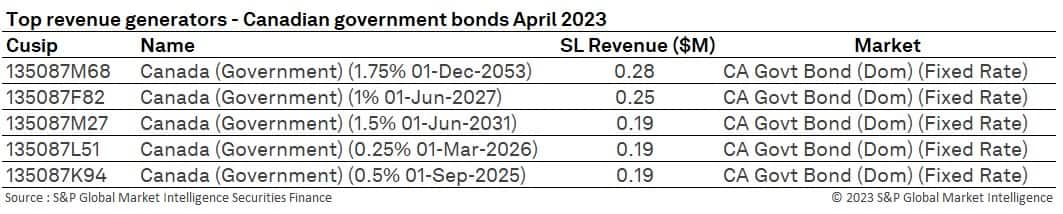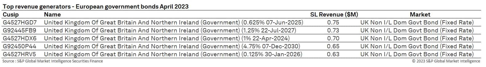 Across the highest revenue generating government bonds, as we have seen previously, short dated issues are commanding the highest fees and generating the strongest revenues. The only exception to this is Canada where the 1.75% 1st Dec 2053 (135087M68) generated the strongest returns for lenders. The pause in any future rate increases may be impacting those bonds with higher duration risk hence the exception to the general trend.
