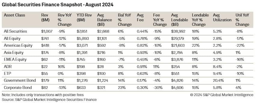 In the securities lending markets, revenues of $1.007B were generated. This represents a 9% decline YoY. Average balances noted a 6% YoY increase across all securities as lendable continued to surge 18% YoY and surpassing $40T for the first time ever on August 27th.