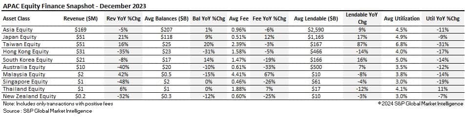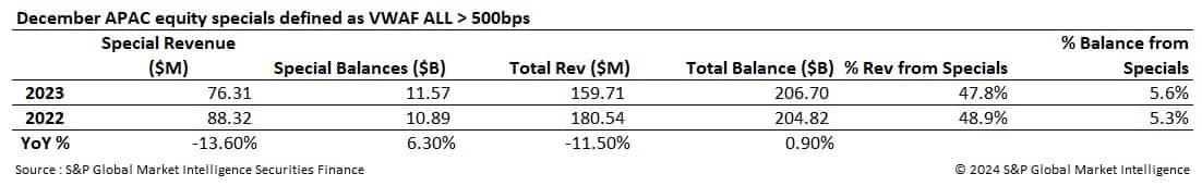 Specials activity across the region suffered during the month with $76.3M being generated (-13.6% YoY). During 2023 specials revenues generated by Asian equities surpassed the $1B mark for the first time since 2019 ($1.052B 2023 vs $959.3M 2022, $942.2M 2021, $653.7m 2020, $1.045B 2019). Throughout 2023, specials revenues provided an average of 47.8% of all monthly revenues from approximately 5.8% of all on loan balances.