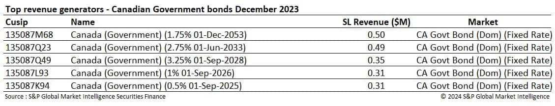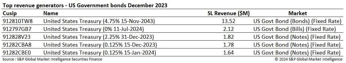 US Treasuries dominated the highest revenue generator table for 2023. Ten-year issues generated the strongest returns (United States Treasury (3.375% 15-May-2033), United States Treasury (2.875% 15-May-2032), United States Treasury (3.5% 15-Feb-2033)) but the top revenue generator was the United States Treasury (4.125% 31-Jul-2028) which produced over $53.8M in revenues during the year. In Europe, the United Kingdom of Great Britain and Northern Ireland (Government) (1% 22-Apr-2024) produced $8.5M and across Canada, the Canada (Government) (2% 01-Dec-2041) was the highest revenue generator with $7.1M in revenues produced.