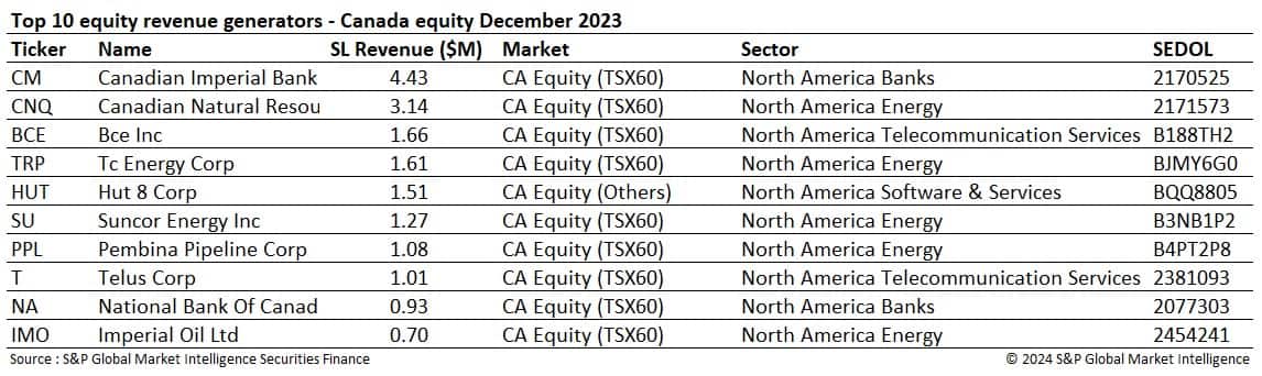 Across Canada, Energy, Telecommunications and Banking stocks all remained the top borrows. Energy stocks have remained a firm favorite amongst borrowers throughout 2023. The energy sector underperformed during the year as growth stocks outpaced value stocks. The decline in gas and oil prices has also been impacting the sector. Over the course of 2023 however, despite appearing regularly in the monthly top ten revenue generator tables, the sector only appeared three times. Enbridge Inc (ENB) was the top revenue producing stock having generated $32.3M, TC Energy Corp (TRP) appeared in seventh place generating $13.99M and Canadian Natural Resources Ltd (CNQ) took ninth place with $12.37M. The rest of the top ten was dominated by banking stocks and one pharmaceutical, biotech company, Canopy Growth Corp (CGC) which generated $13.9m over the year.
