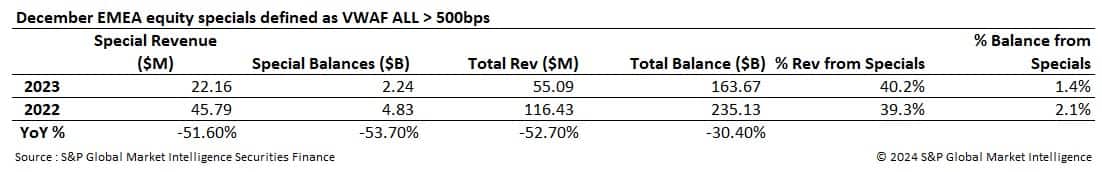 Specials activity remained subdued. December represented the second lowest specials revenue producing month of the year after October ($22.16M December vs $22.08M October). Specials revenues over the month declined by 52% YoY in line with specials balances which also declined by over 50%. During 2023, EMEA equities generated $440.26M in specials revenues, the lowest since 2017 ($340.87M). Over the year an average of 36% of all revenues were derived from specials activity from an average of 1.6% of all balances.