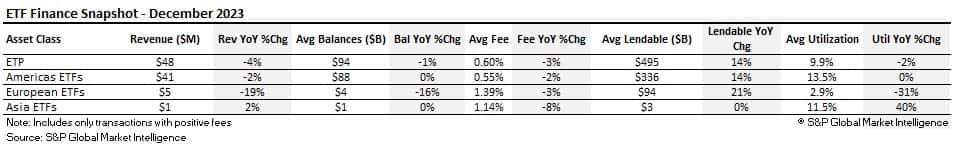 In the securities lending markets ETFs generated $48M in revenues during the month. Average utilization for both Americas and Asia ETFs remained above 10% with Asia ETFs posting a 40% increase YoY. Average fees declined YoY across the board despite increases in average fees MoM seen across both European and Asian ETFs.