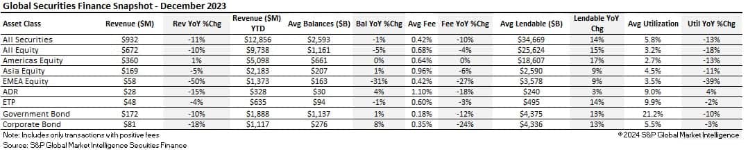 During December, $932M of revenues were generated, an 11% decline YoY. December was a poor month for securities lending activity with declines seen across nearly all metrics. EMEA equities suffered their worst revenues of 2023, APAC revenues suffered from a decline in demand and government bonds experienced lower demand over year end than they have experienced for many years.