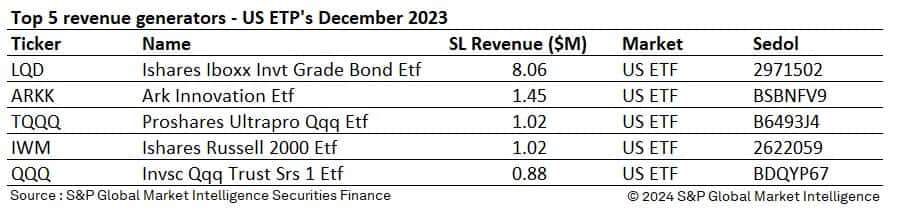 Throughout 2023, as was seen during 2022, high yield and investment grade ETFs dominated the revenue tables. Ishares Iboxx High Yield Bond ETF (HYG) generated $64.4M during 2023 and was the top earner. This was followed by Ishares Iboxx Invt Grade Bond ETF (LQD) which generated $25.8M. Fixed income ETFs dominated the top ten table as moves in interest rates continued to produce opportunities for lenders. SPDR S&P Biotech ETF (XBI) $25.19M and ARK Innovation (ARKK) $19.96M were the top equity ETF revenue generators of the year.