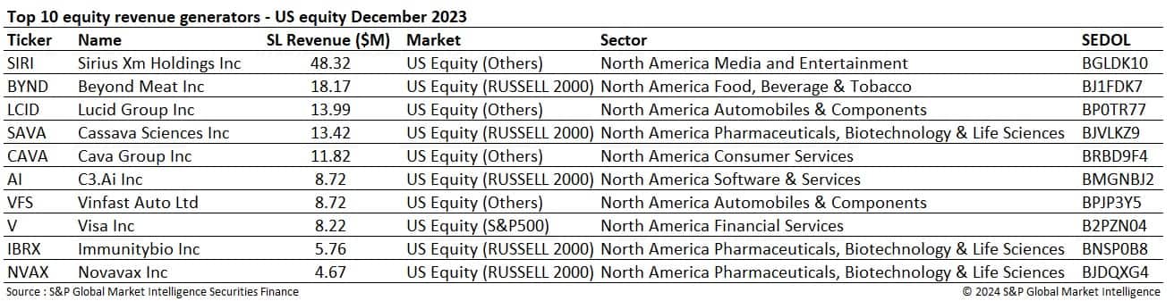 2023 tuned out to be a blockbuster year that very few predicted. The S&P 500 finished the year 24% higher and despite a slow-down in securities lending revenues towards the end of the year, 2023 was another banner year for securities lending revenues. Annual revenues of $12.856B were produced, an increase of 3% YoY. 2023 was a year of higher fees and lower balances, a trend that was driven by some incredibly special stocks that generated some impressive returns. AMC Entertainment was the stand-out stock of the year generating a massive $661.25M in revenues alone. Without this trade, annual revenues would have been 3% lower than those produced during 2022. US equities provided some impressive returns and opportunities for lenders over the year and remained a strong focus throughout.