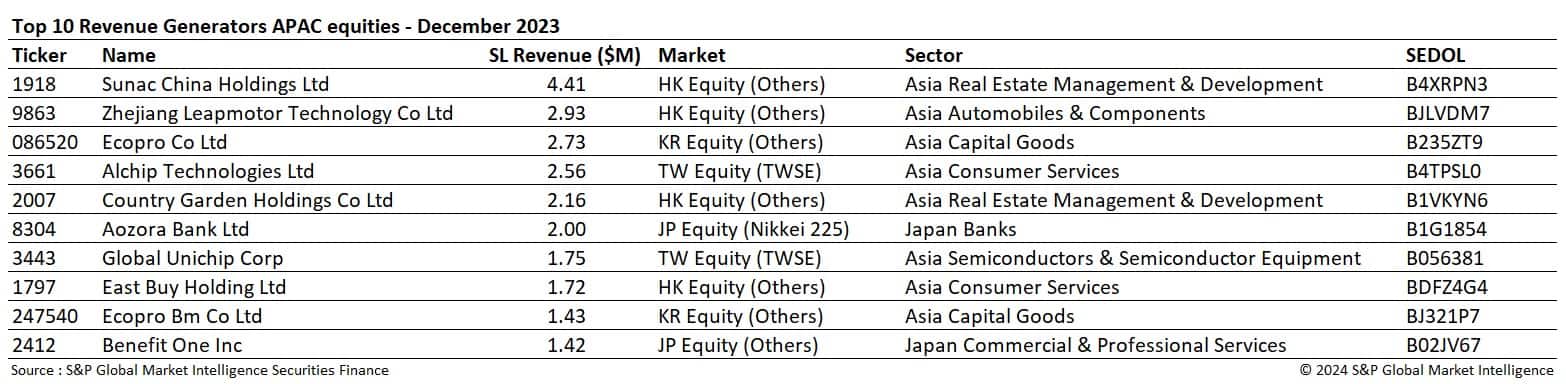 Sunac China Holdings Ltd (1918) remained the highest revenue generating stock over the month of December. The property sector remains in focus across the region as well publicized issues regarding funding requirements remain in the headlines. The two property companies seen in the table are also present in the top ten revenue generators of the year. Sunac China Holdings Ltd (1918) generated a total of $20.1M during 2023 (5th place) and Country Garden Holdings Co Ltd (2007) generated $37.1M during the year (2nd place). The highest revenue generating Asian equity stock of 2023 was Ecopro Co Ltd (247540) which produced $67.1m in revenues during 2023.